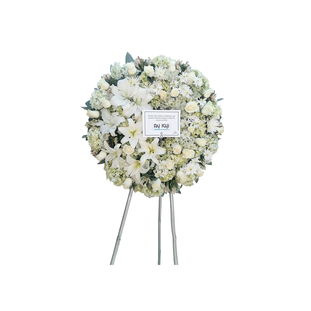 Hortensias, rosas blancas, margaritas, lirios blancos.