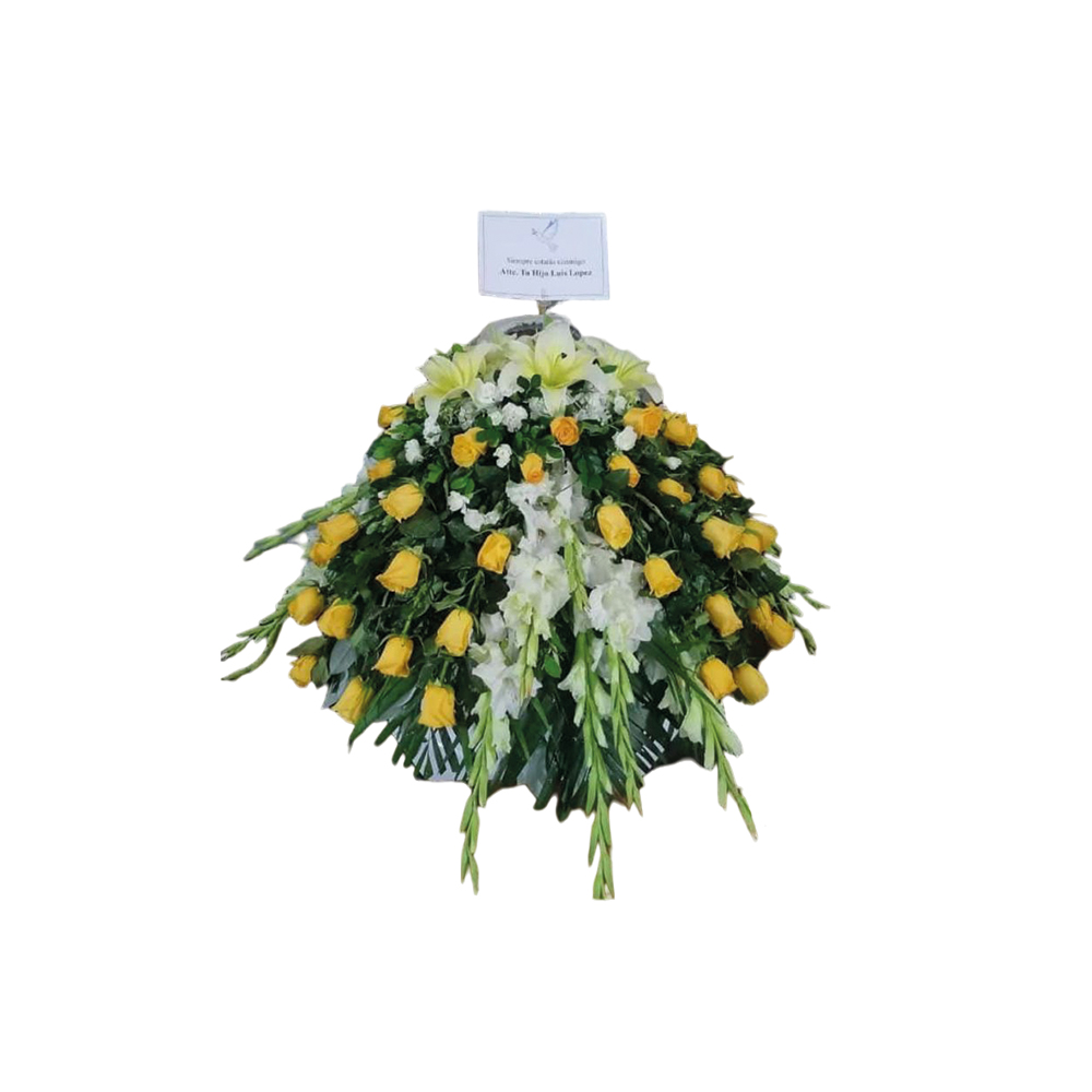Gladiolos blancos, rosas rojas, lirios crema.